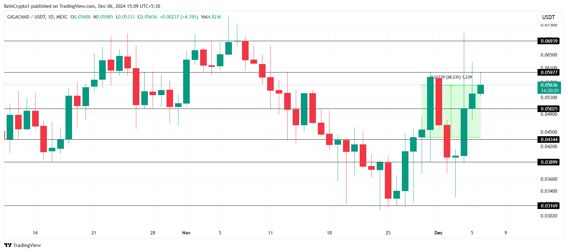 GIGAs nästa viktiga mål är att omvandla 0,0597 USD till en solid stödnivå. Att framgångsrikt hålla denna nivå skulle bana väg för en ökning till 0,0639 USD. En ihållande rörelse över denna nivå kan avsevärt öka investerarnas vinster och ytterligare befästa GIGAs uppåtgående trend på kort sikt.