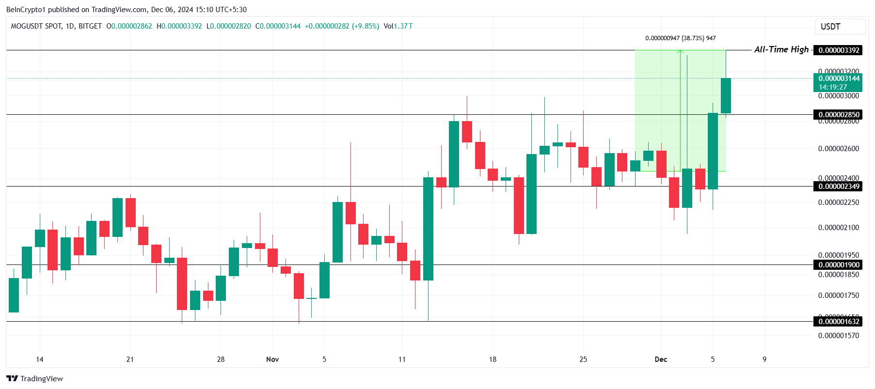 MOG har stigit 38 % den senaste veckan, vilket har drivit upp priset till 0,000003144 USD. Altcoinet satte också ett nytt rekord på 0,000003392 USD, vilket visar på starkt momentum.