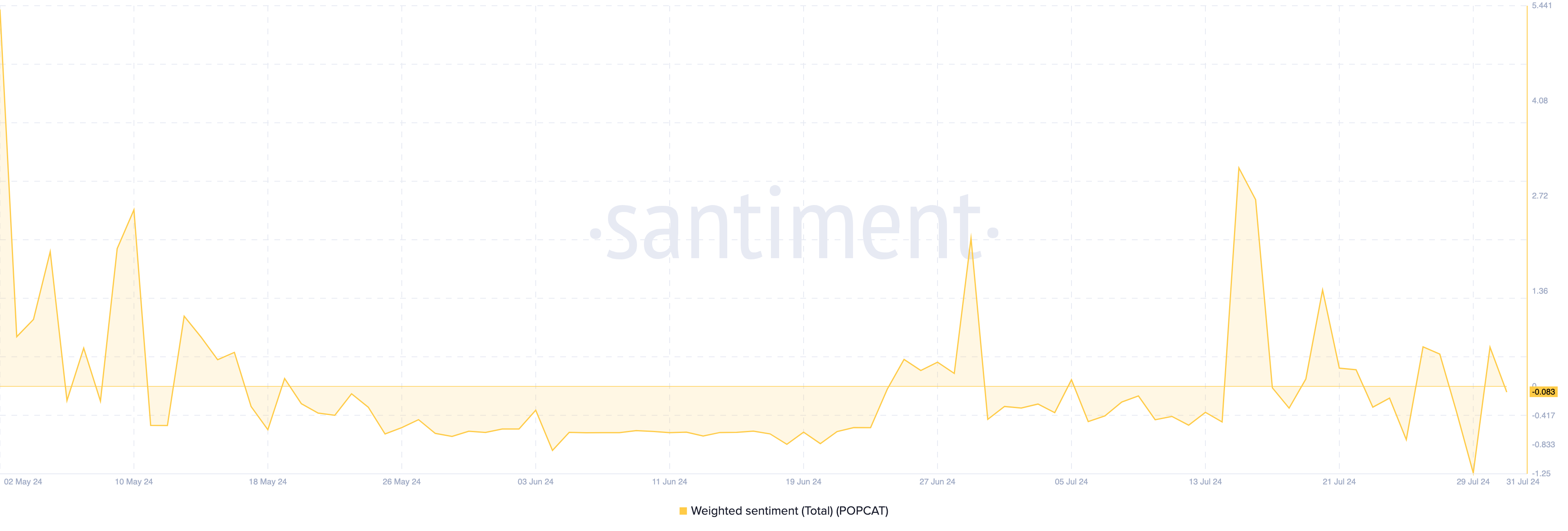 Samtidigt har POPCAT också sett en anmärkningsvärd minskning av öppet intresse (OI), som visas ovan. Enligt Santiment uppgick OI till nästan 70 miljoner dollar den 27 juli. Men vid presstillfället hade den sjunkit till 44,92 miljoner dollar.