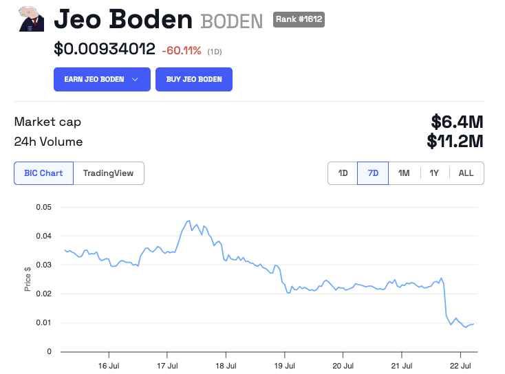 Dessutom sjönk meme-mynt med Biden-tema, inklusive de som är uppkallade efter hans familjemedlemmar, med mer än 60%. “Jeo Boden” (BODEN) token föll med 60,11% inom 24 timmar efter hans tillkännagivande. Denna nedgång raderade nästan 10 miljoner dollar från dess börsvärde, som hade legat på cirka 15 miljoner dollar bara några dagar tidigare.
