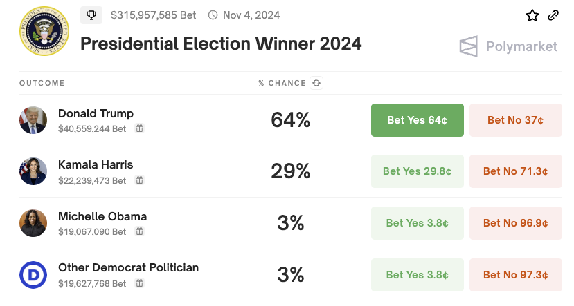 Enligt Polymarket-data fortsätter Donald Trump att behålla sin topposition, med 64 % odds att vinna valet.
