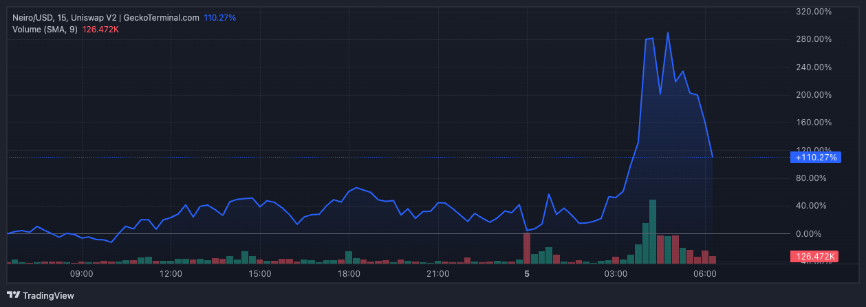 Meme-myntet Neiro (NEIRO) har sett en anmärkningsvärd prisökning trots att Ethereums medgrundare Vitalik Buterin sålde hela sitt innehav. Efter en kort nedgång återhämtade sig Neiro och sköt också i höjden och uppnådde en ökning med 110% under de senaste 24 timmarna.