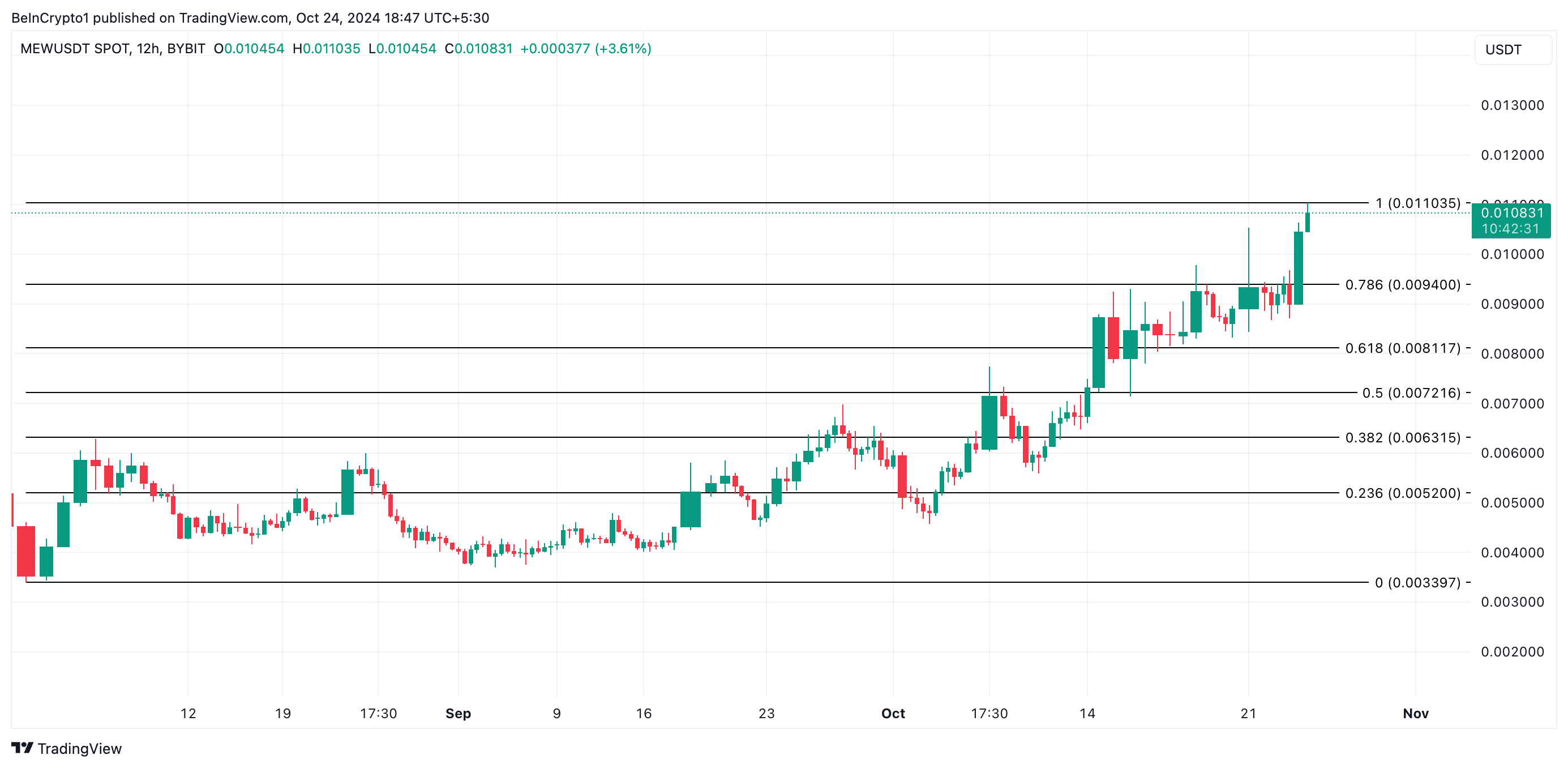 MEW steg kort till ett nytt rekordhögt värde på 0,01066 USD i torsdags innan det upplevde en liten nedgång. För närvarande handlas meme-myntet till 0,01056 USD, en minskning med 2% från sin topp.