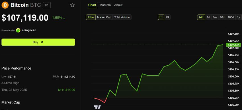 Just nu handlas den ledande krypton för 107 119 USD, upp nästan 2 % de senaste 24 timmarna.