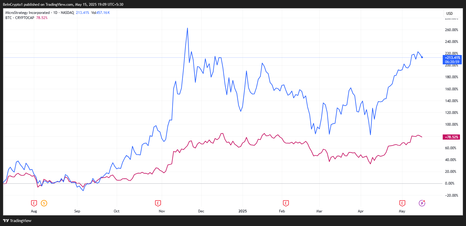 Detta diagram jämför MSTR-aktiens och BTC:s marknadsvärde från mitten av 2023 till mitten av 2025.