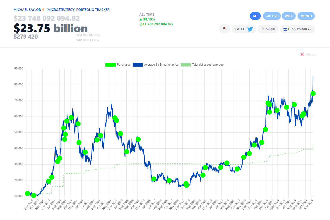 Data från “Saylor Tracker,” ett verktyg som övervakar MicroStrategys Bitcoin-investeringar, visar att företagets avkastning på BTC översteg 100 % den 10 november. Innan det senaste köpet var företagets innehav redan värderade till över 20,5 miljarder USD.