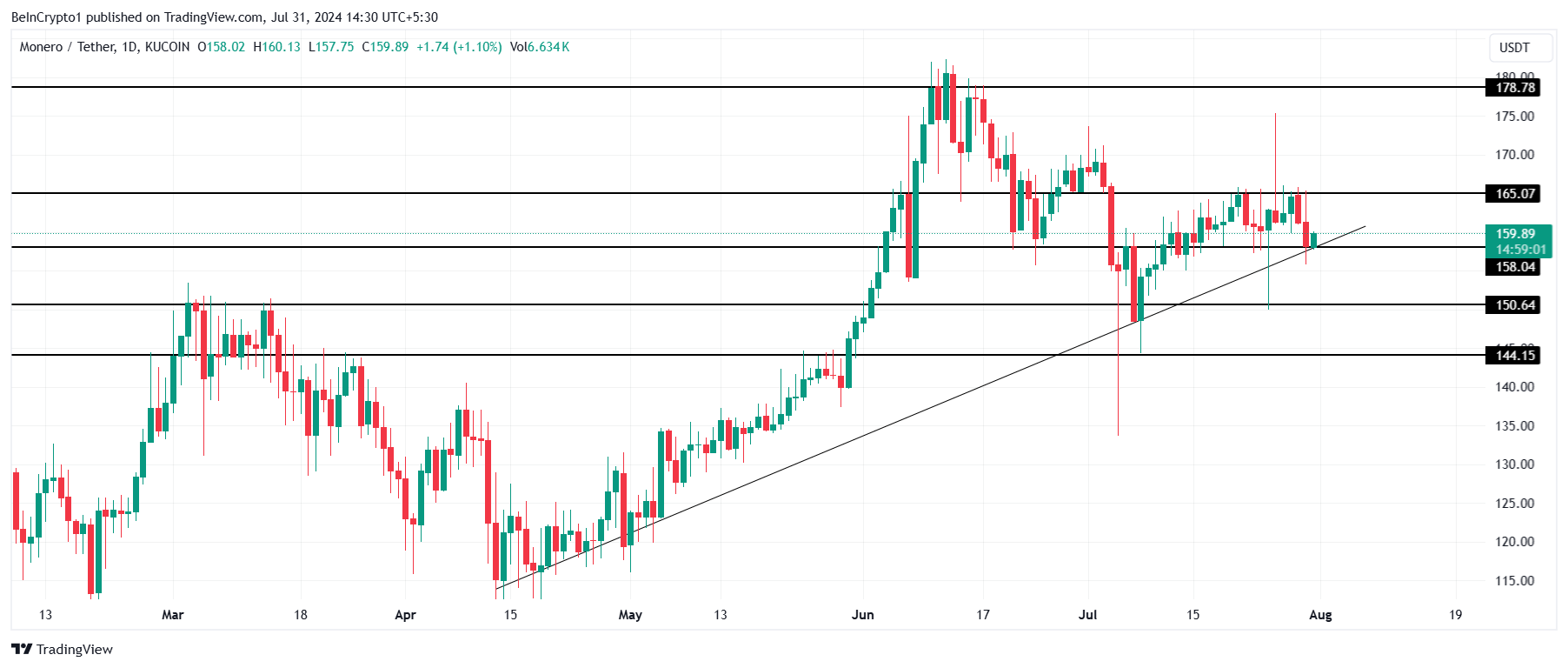 Moneros pris på $159 hittar stöd över flera avgörande nivåer. Men nu uppstår oron. XMR:s två misslyckade försök att bryta motståndet vid $165 är orsaken till denna oro.
