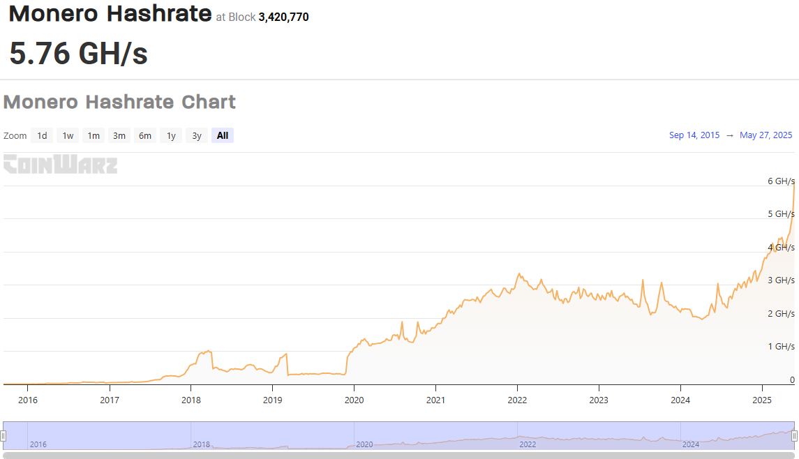 En stor drivkraft var Moneros ökande hashrate i maj. Enligt CoinWarz nådde Moneros hashrate 6,33 GH/s, den högsta nivån någonsin.
