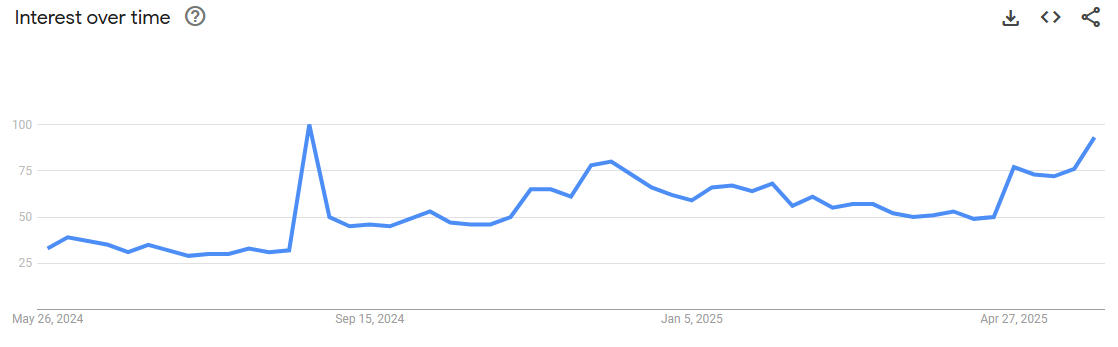 Google Trends-diagrammet visar att sökningar efter Monero har legat över 50-poängsgränsen under hela 2025. Under de senaste två månaderna har den poängen ökat avsevärt. Den ligger nu på 90, den högsta sedan augusti 2024. Denna uppmärksamhetsspik kommer mitt i rykten om att XMR kan listas om på stora börser.