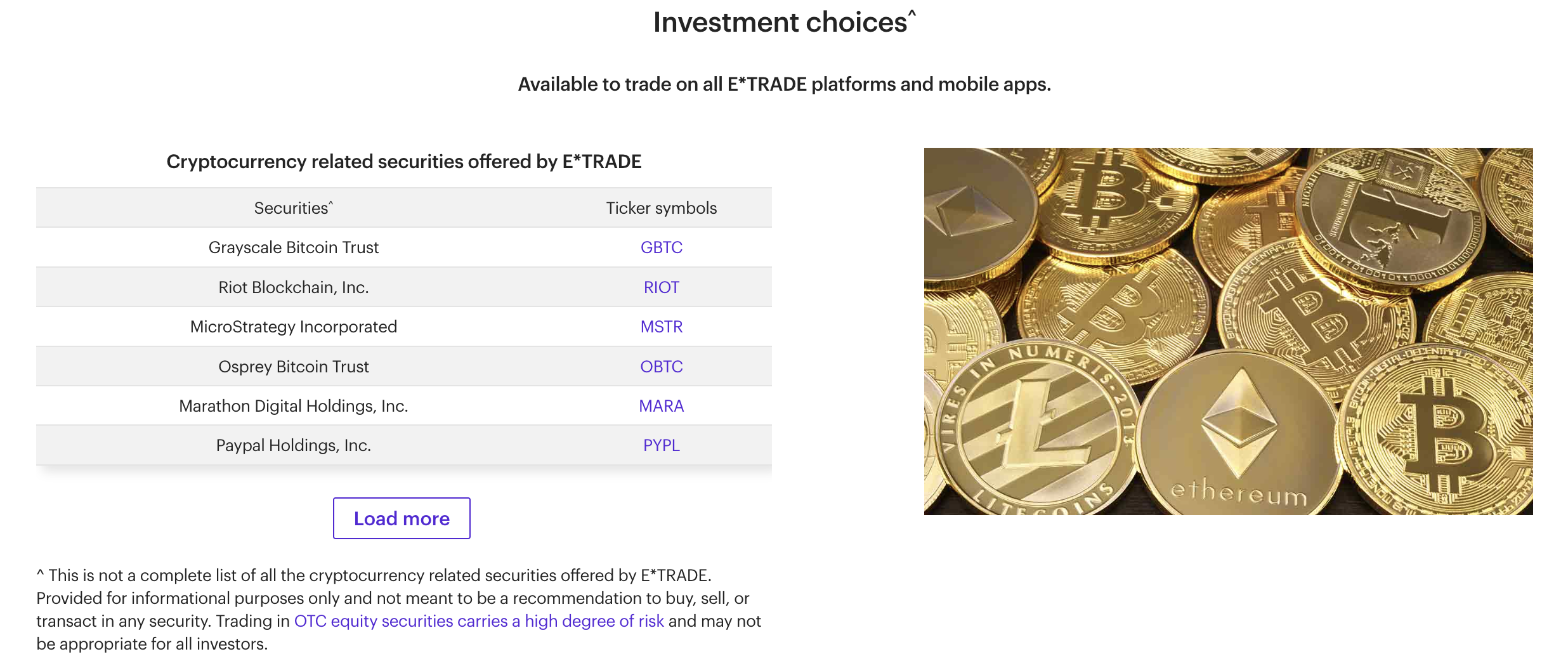 Men denna plan är fortfarande i utforskningsstadiet. E-Trades lista över investeringsalternativ nämner bara indirekt exponering mot kryptovaluta och annonserar denna typ av tillgång. Om denna plan går igenom skulle Morgan Stanley avsevärt förändra sin nuvarande relation med kryptoerbjudanden.