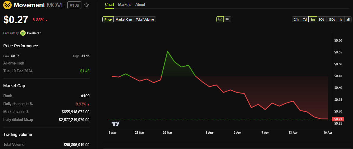 Följderna ledde till en kraftig utförsäljning, vilket pressade MOVE:s pris under 0,30 USD, vilket markerade nya bottennivåer för token.