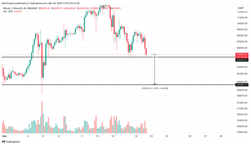 Trots dessa långsiktiga optimistiska förutsägelser uppvisar Bitcoins nuvarande marknadstendenser en björnig tendens. Den är för närvarande i färd med att testa en viktig stödnivå på 64 500 dollar. Skulle den falla under denna nivå, kan vi se ett prisfall på över 7% till nästa stödzon, som befinner sig mellan 59 000 och 60 000 dollar.
