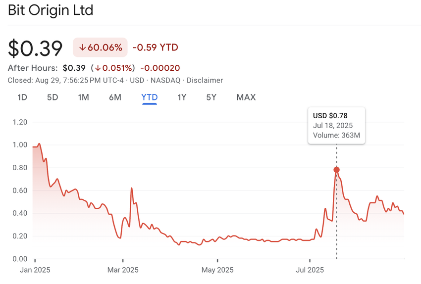 Dock har aktieprestationen för dessa företag hittills varit svag. Bit Origins aktie (BTOG) steg till en topp på 1 USD den 18 juli men hade fallit till 0,39 USD vid stängning den 29 augusti.