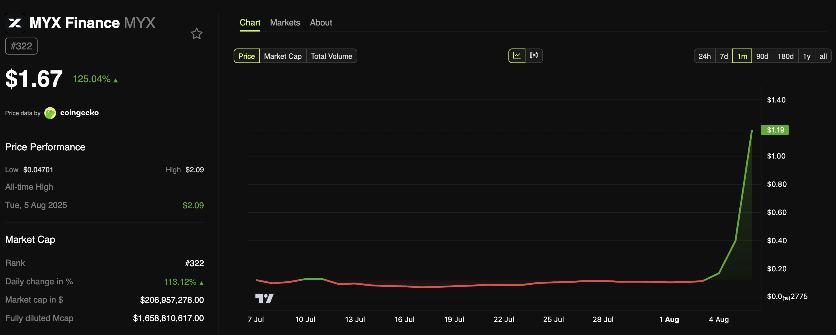 Efter rekordnivån sjönk MYX något och handlades till 1,67 USD vid pressens tidpunkt. Det var ändå upp 125 % det senaste dygnet, vilket gjorde det till den största dagliga vinnaren på CoinGecko. MYX:s marknadsvärde har också ökat från nästan 15 miljoner USD till över 200 miljoner USD.