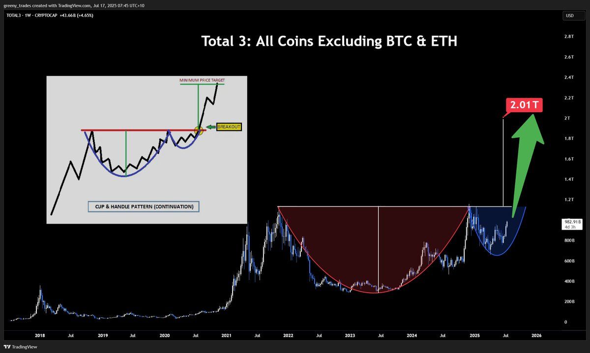 För andra investerare är teknisk analys av altcoin-marknadens kapitalisering (TOTAL3) en vägledning. Analytiker som Peter Brandt och Greeny tror att TOTAL3 bildar ett kopp-och-handtag-mönster.