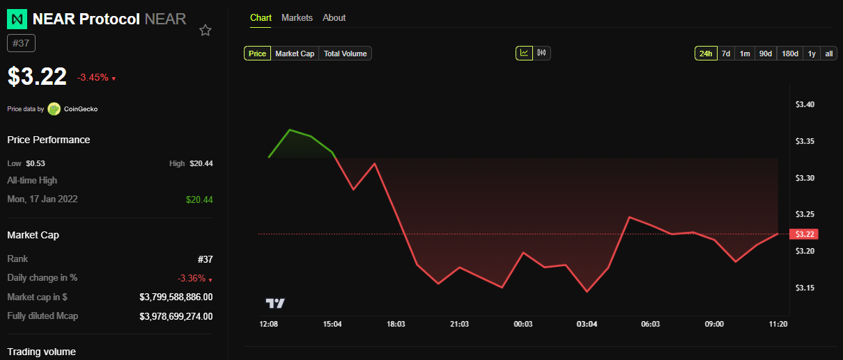 Trots dessa nyheter har Near Protocols drivande token minskat med över 3 % sedan fredagens session öppnade. BeInCrypto-data visar att NEAR handlades för 3,22 USD vid denna skrivning.