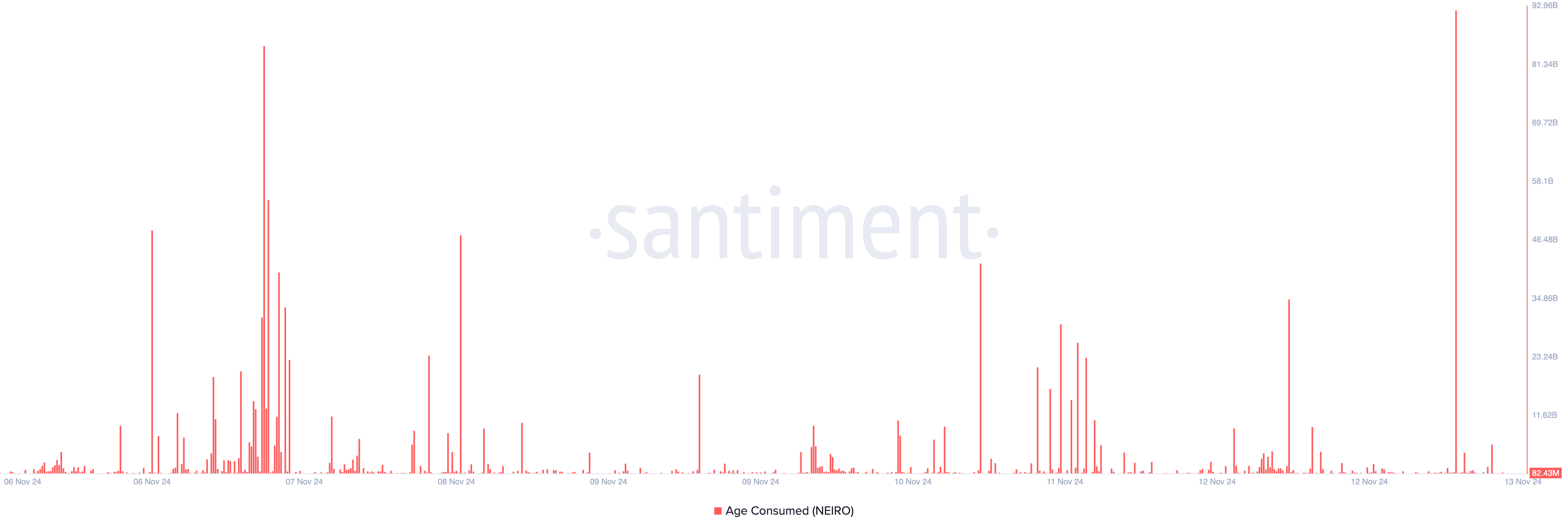 Under onsdagens tidiga handelstimmar noterade NEIRO:s ålderskonsumerade mått, som spårar rörelsen av länge hållna mynt, en betydande ökning. Enligt Santiments data sköt den i höjden till en veckohögsta på 92,04 miljarder.