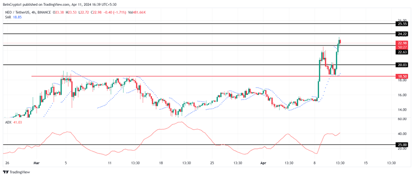 Det genomsnittliga riktningsindexet (ADX) över 25.0-trösklarna antyder att den aktiva uptrend får styrka. Detta innebär att NEO sannolikt kan fortsätta stiga under de kommande dagarna.