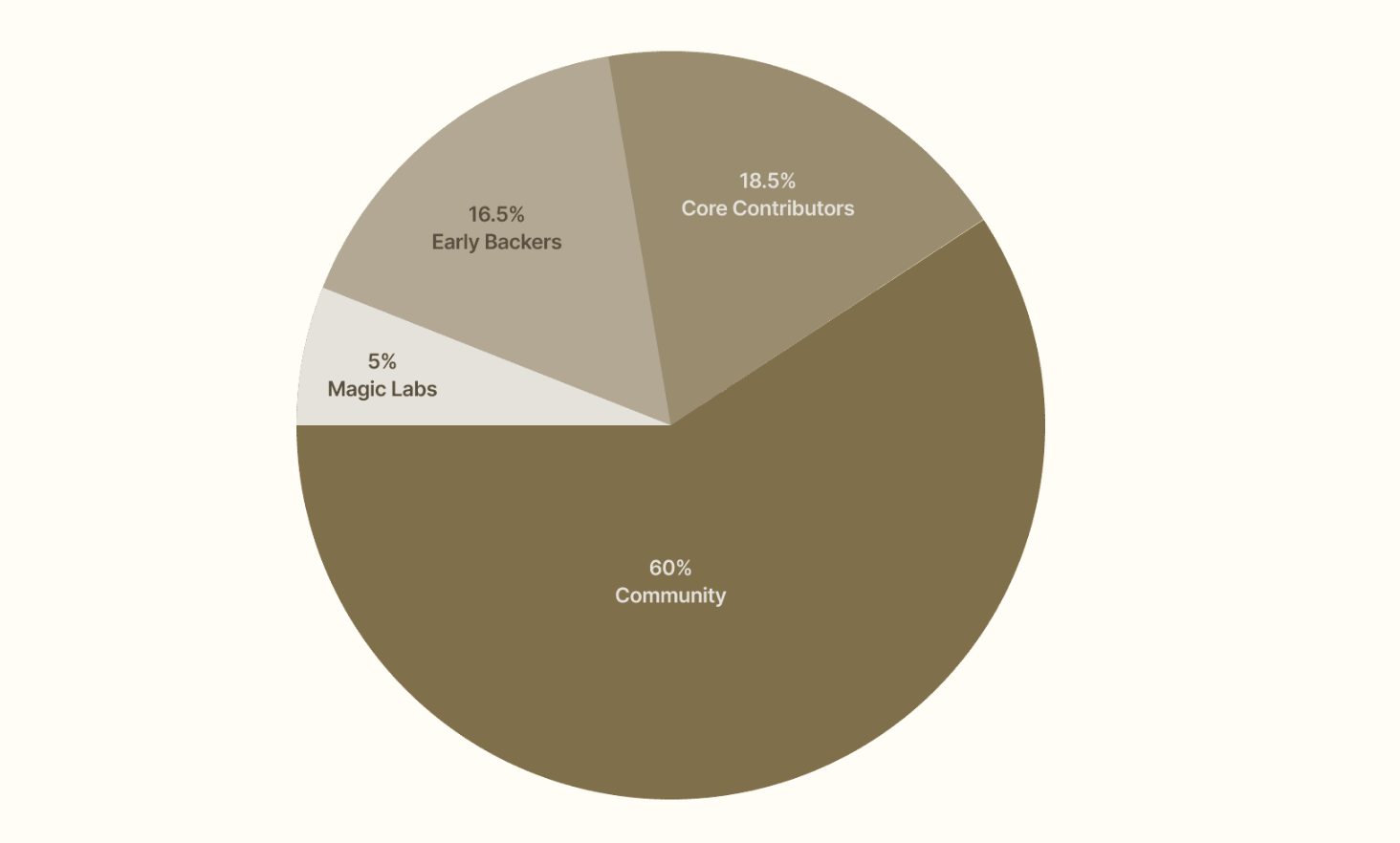 Teamet har allokerat 60 % av den totala försörjningen till gemenskapsinitiativ, inklusive incitament, belöningar, likviditet, utvecklingsfonder och kassastöd. Denna fördelning syftar till att driva tillväxt och främja protokollets decentralisering. Teamet har allokerat 40 % till interna intressenter, inklusive kärnbidragare, tidiga investerare och Magic Labs. Detta involverar vesting-scheman och gradvis distribution.