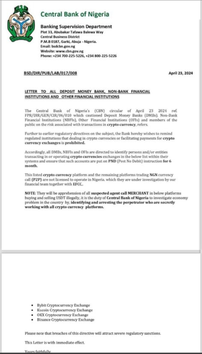 I ett brev som kom fram den här veckan, CBN riktade finansinstitut att noga övervaka och rapportera om aktiviteterna som involverar Bybit, KuCoin, OKX, och Binance.