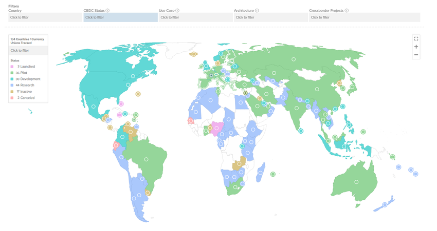 CBDC:er är blockkedjebaserade versioner av statligt utgiven valuta som är utformade för att påskynda transaktioner i fiatvaluta. Enligt Atlantic Council CBDC tracker har dessa valutor fått global dragkraft, med en överväldigande majoritet av nationer och valutaunioner – som utgör 98 % av den globala BNP – som överväger att införa dem.
