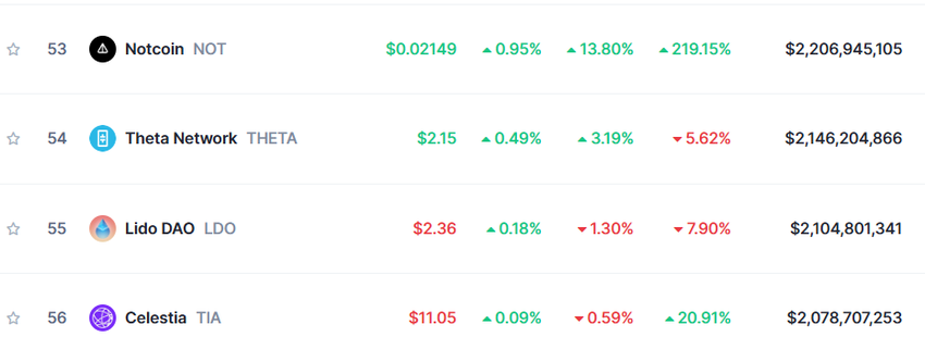 Den senaste tidens rally har redan resulterat i att Notcoin överträffar sådana som Lido DAO (LDO), Celestia (TIA), ThorChain (RUNE), Fetch.ai (FET) och många andra. Nästa på listan är Fantom (FTM) och BONK, vars överskridande skulle föra NOT till topp 50 tillgångslistan.