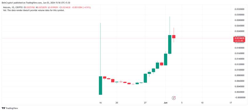 Notcoins pris har redan ökat med nästan 100% under de senaste två dagarna, vilket har ökat från $ 0.011 till $ 0.021 i skrivande stund. Altcoin markerade till och med en ny heltidshöjd på 0.029 $ igår, vilket gjorde det till det första sedan tillgångens lansering den 16 maj.