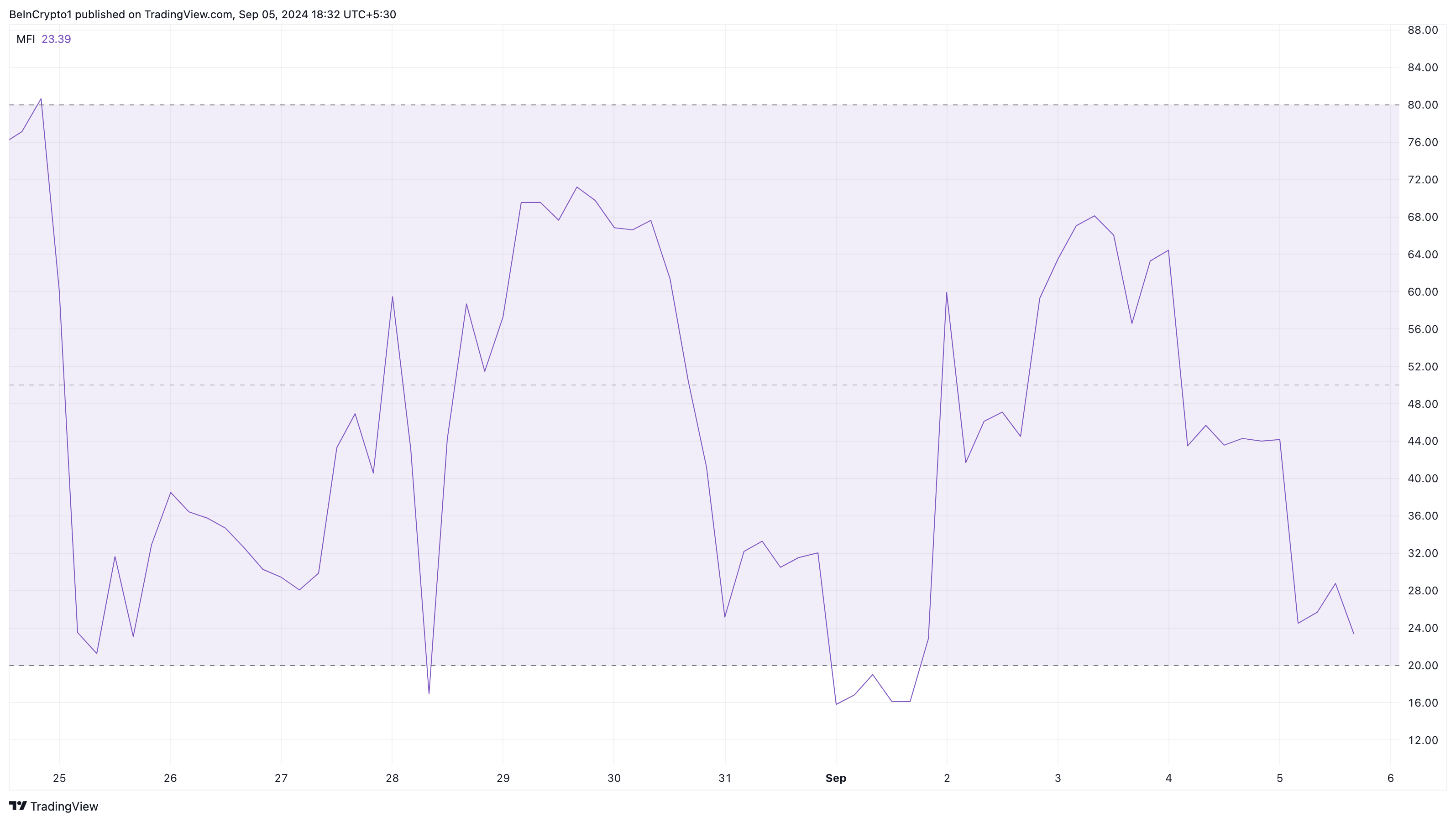 För närvarande är MFI nere på 23,39, vilket tyder på att Notcoin har litet till inget betydande köptryck. Därför kan en återhämtning kanske inte ske på kort sikt.