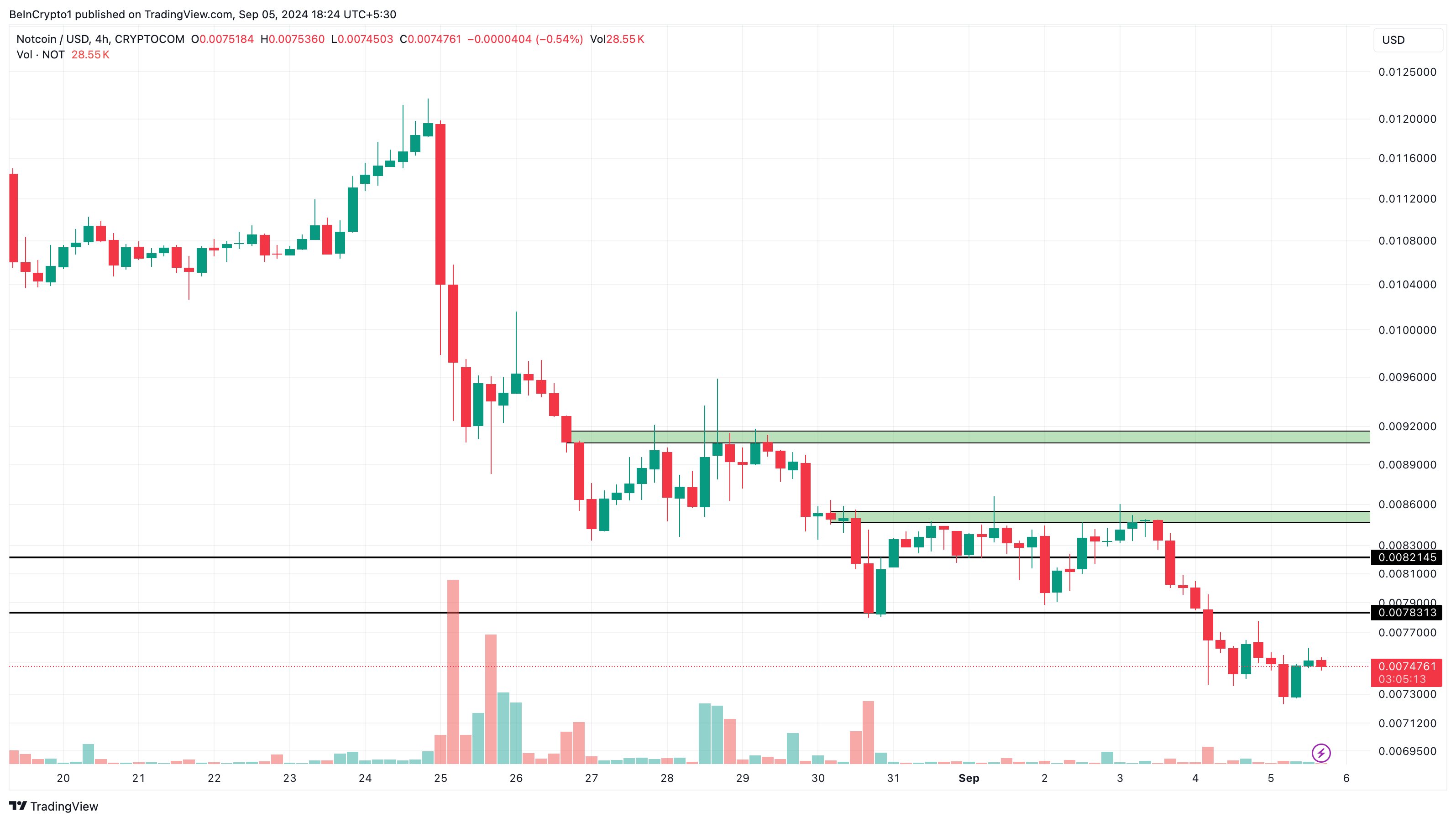 I juni hade Notcoin återhämtat sig från tidigare förluster och nådde en rekordhög nivå på 0,028 USD. För närvarande är token ned 78% från den toppen och handlas till 0,0074 USD. En titt på 4-timmarsdiagrammet visar betydande motstånd vid nivåerna 0,0085 USD och 0,0090 USD, vilket kan utgöra utmaningar för uppåtgående momentum på kort sikt.