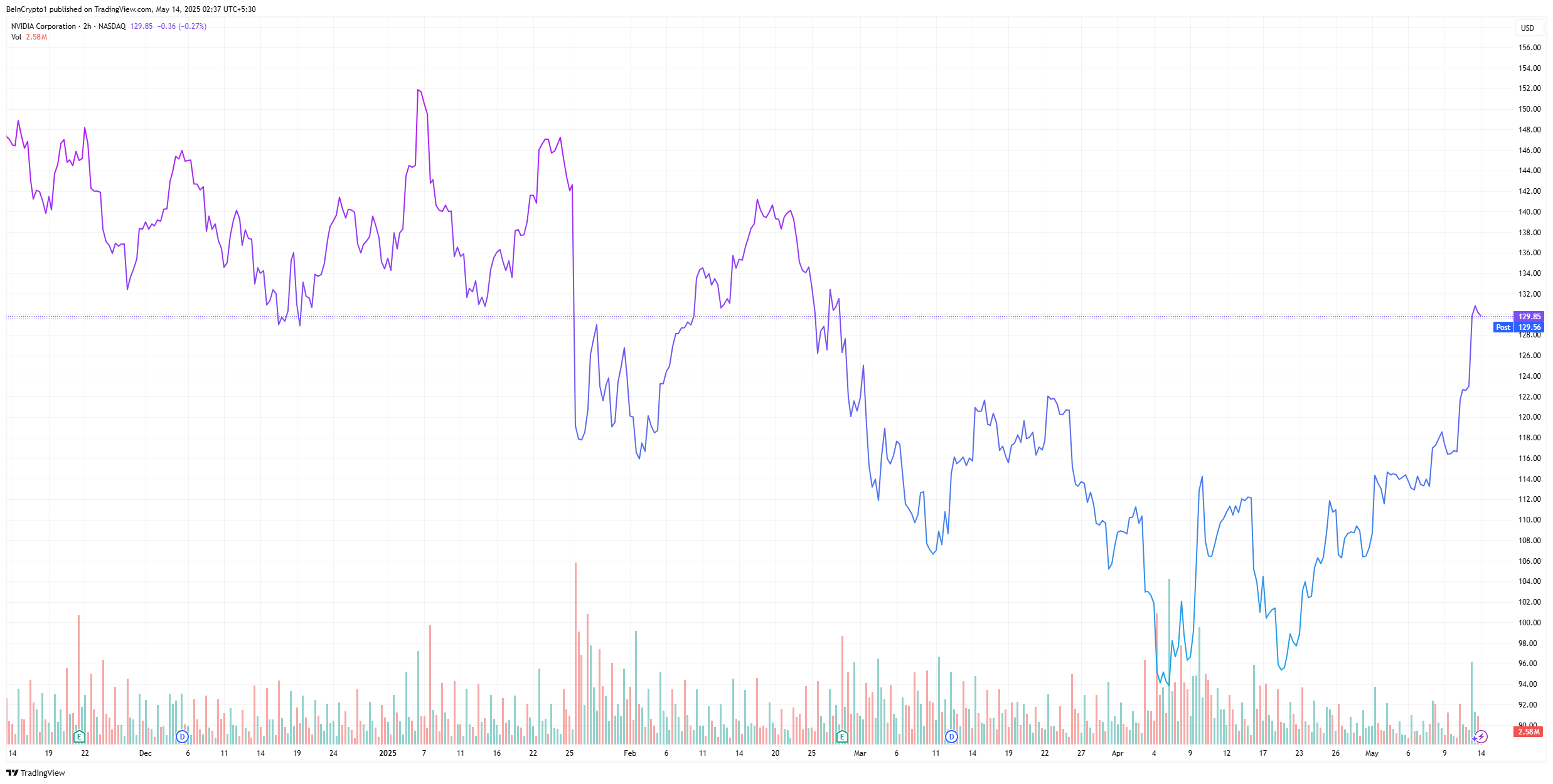 “Riskfyllda tillgångar har generellt underpresterat under de tidiga månaderna av 2025, trots tecken på en nylig återhämtning. Dessutom utgör växande konkurrens, särskilt inom GPU- och AI-sektorerna, ett hot mot Nvidias marknadsledarskap och ökar möjligheten till minskad marknadsandel. Pågående amerikanska tullar utgör också en betydande risk, med liten klarhet om deras framtida riktning. Sammantaget har dessa faktorer troligen fått vissa investerare att minska sin exponering mot Nvidia, och låsa in vinster efter en anmärkningsvärd uppgång som såg aktiekursen stiga cirka x9 mellan början av 2023 och början av 2025,” Matteo Greco, Senior Associate på FINEQIA, berättade för BeInCrypto.