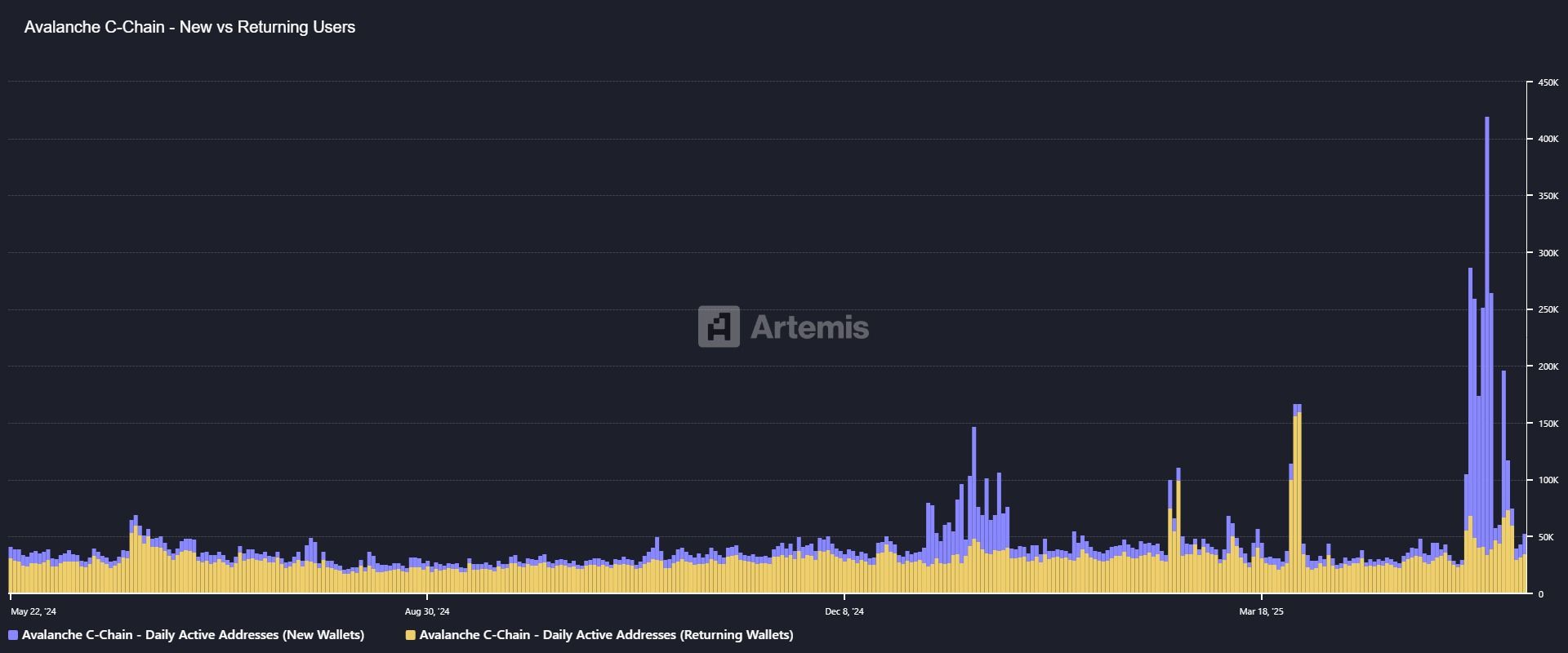 Artemis diagram visar daglig aktivitet i maj från 50 000 till 400 000 adresser. Nästan 80% av dessa var nya användare. Samtidigt blev återkommande användare också mer aktiva, ökade med cirka 30% jämfört med genomsnittet av tidigare dagar.