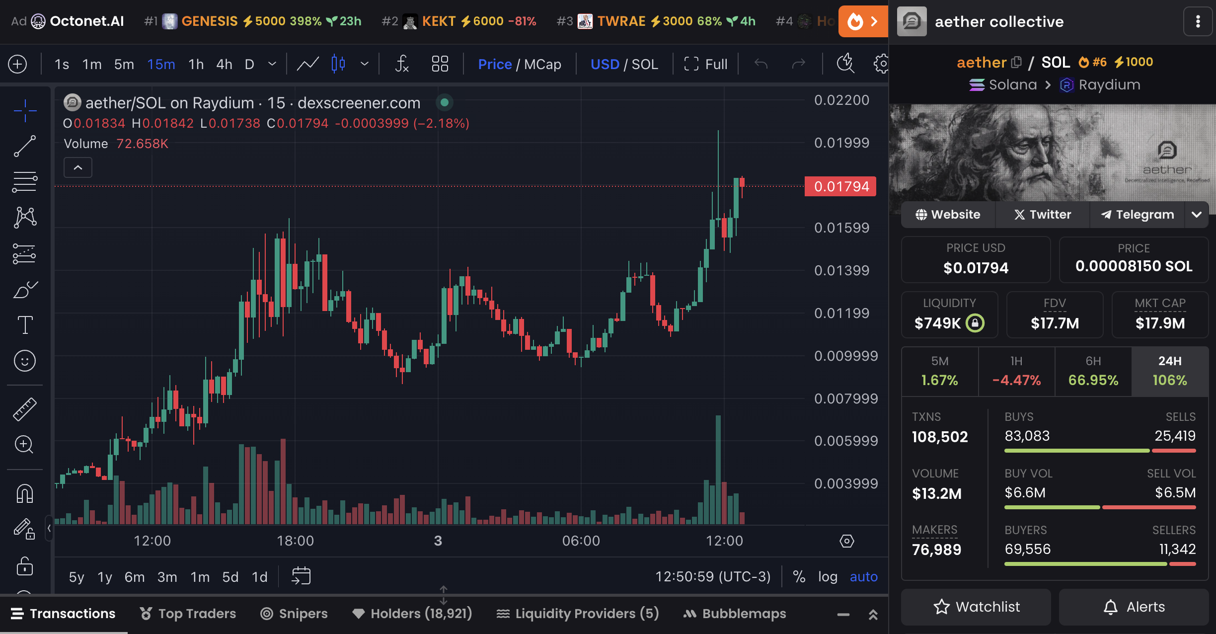 Det lanserades först på Solanas Pump.fun, som lockar mer än 30 000 nya kryptovalutor per dag. Aether flyttade snabbt till Raydium och har nu nästan 19 000 innehavare och över 108 000 transaktioner dagligen, bara 4,5 dagar efter lanseringen.