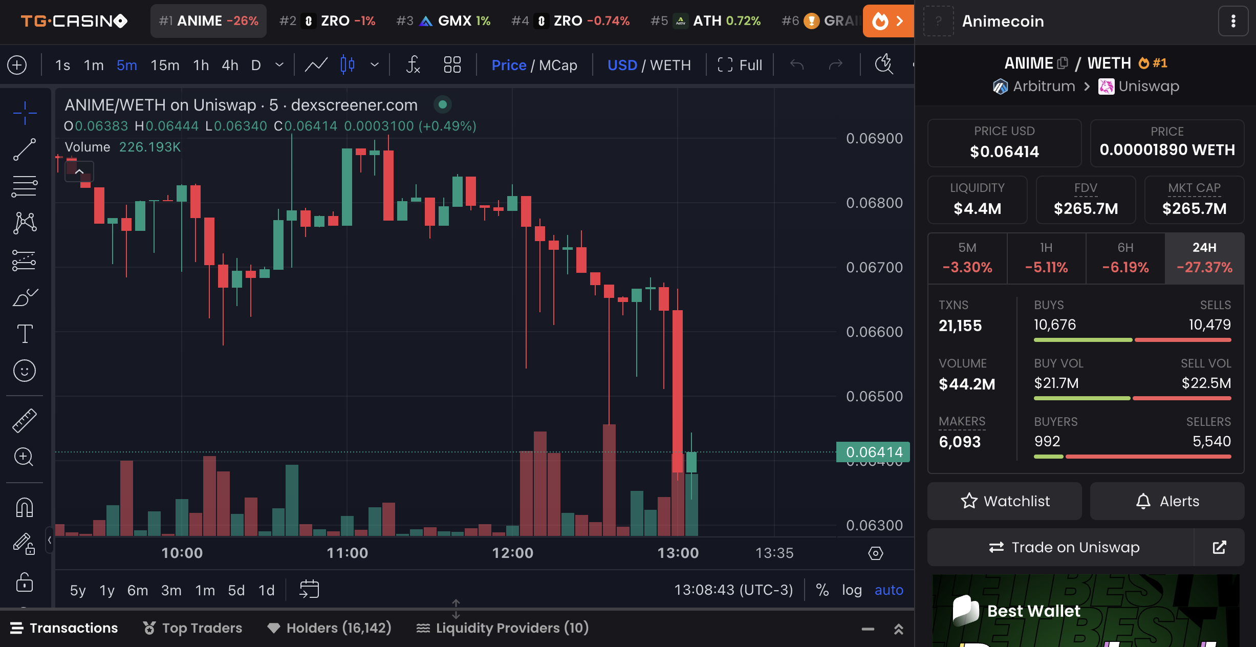 Byggd på Arbitrum, har ANIME redan nått ett marknadsvärde på 265 miljoner USD med över 16 000 innehavare. Trots sin imponerande start har priset sjunkit 27 % de senaste 24 timmarna, även om det registrerade 44 miljoner USD i daglig handelsvolym.