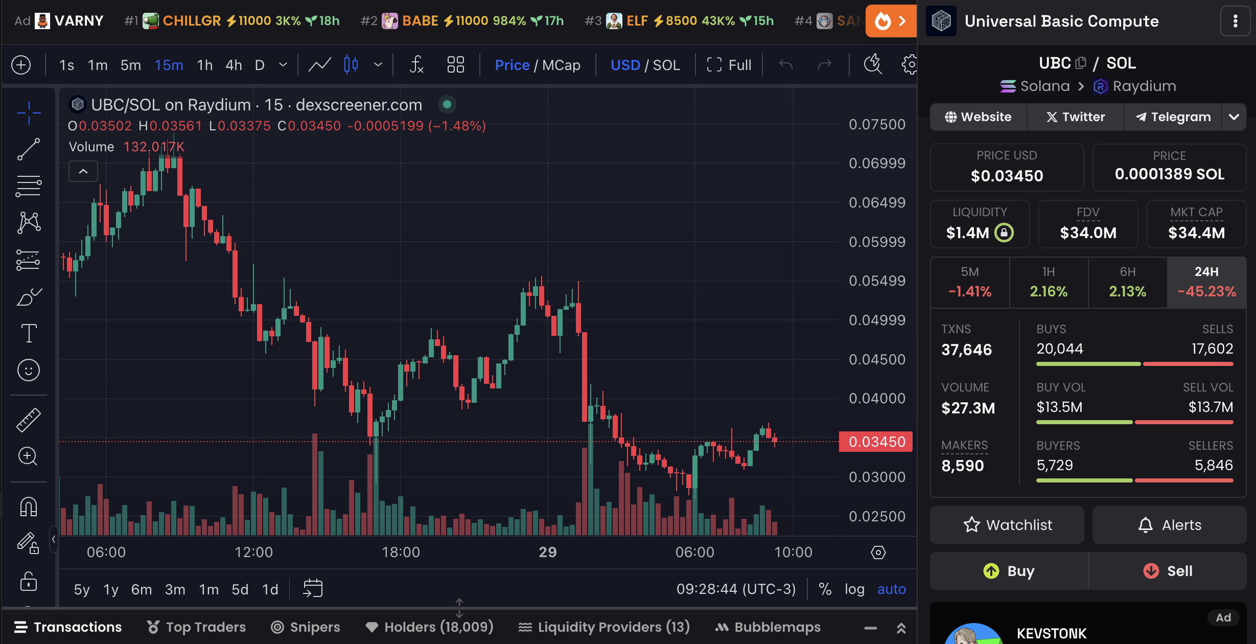 Universal Basic Compute (UBC), som lanserades för bara fyra dagar sedan, har snabbt fått uppmärksamhet. Med över 37 000 dagliga transaktioner och mer än 18 000 innehavare är det en av de mest framgångsrika nyintroducerade mynten denna vecka, särskilt i Solana-ekosystemet.