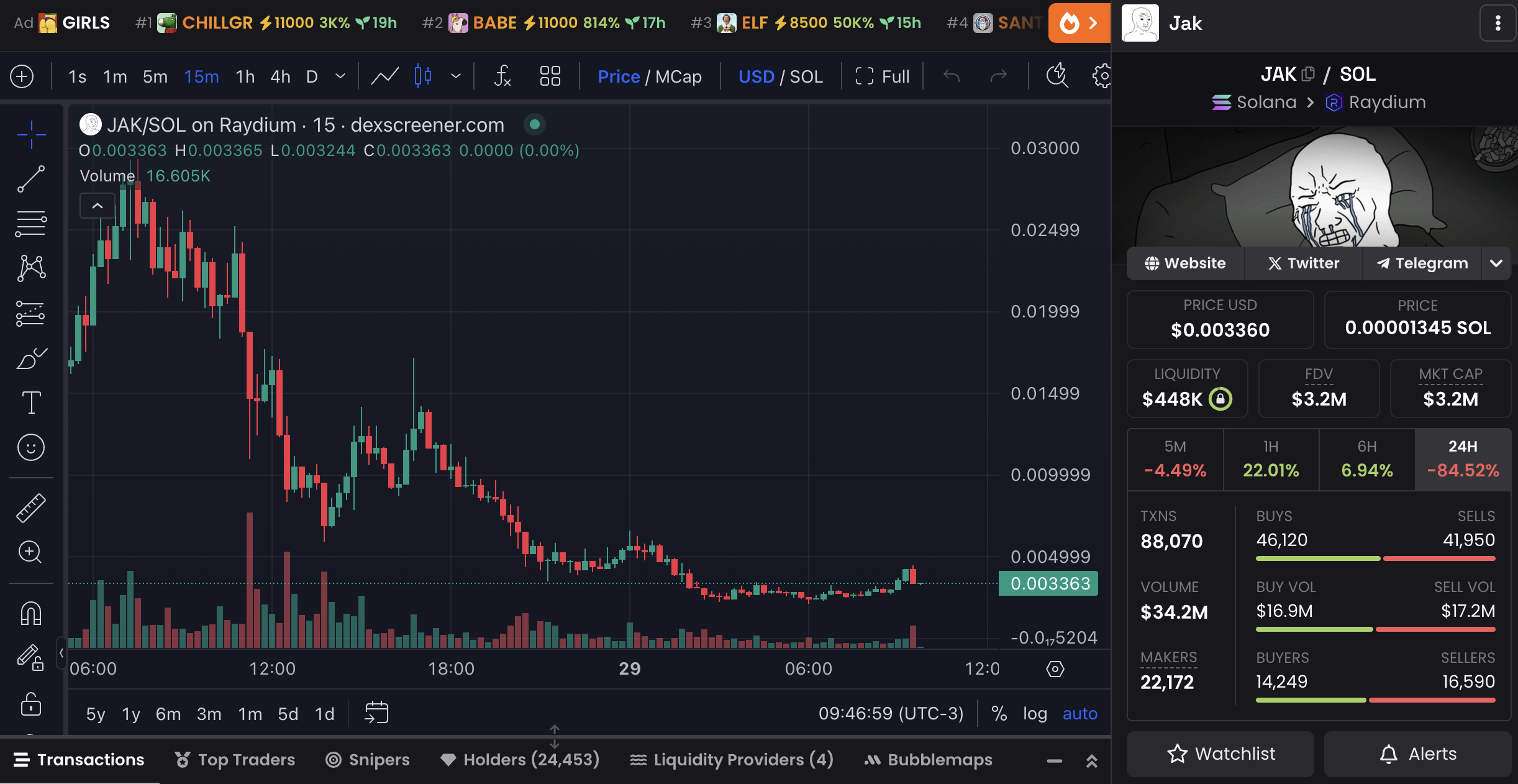 Men dess marknadsvärde har sjunkit med 45% de senaste 24 timmarna, från 48 miljoner USD till 34 miljoner USD, vilket återspeglar betydande säljtryck efter den initiala ökningen.