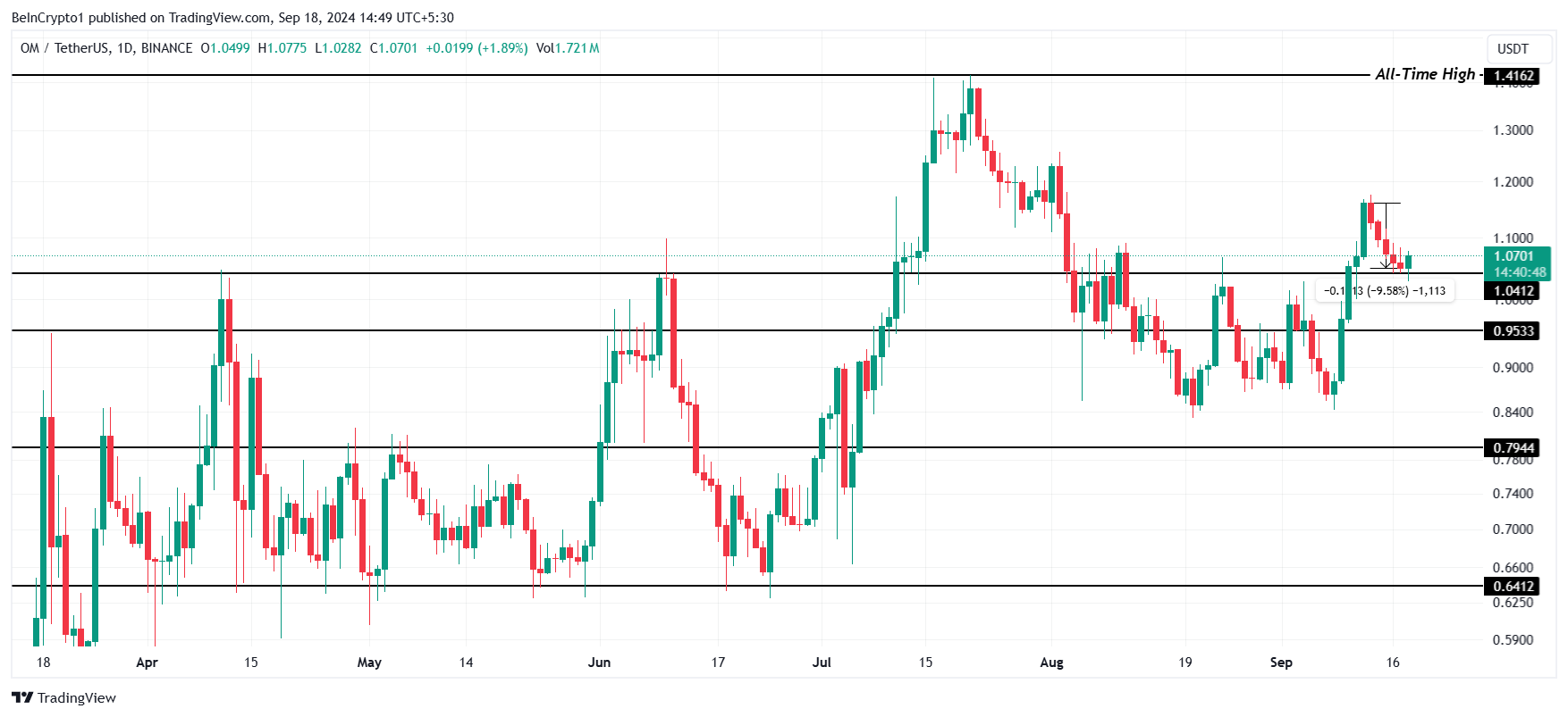 OMs pris har minskat med 9,5% under de senaste fem dagarna men håller för närvarande över stödnivån på 1,04 USD. Detta stöd kan ge en grund för altcoinen att återhämta sig, med potential att klättra mot sitt rekordhöga på 1,41 USD.