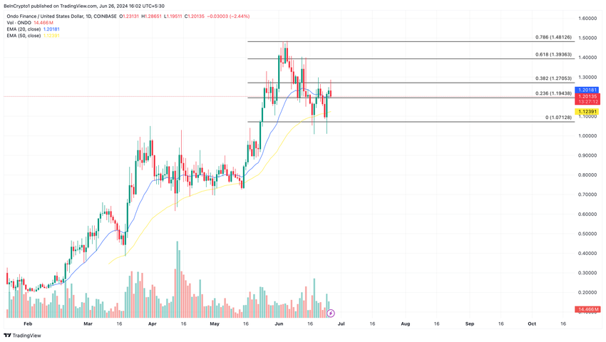 Några av de viktigaste tidsramarna är 20 EMA, 50 EMA och 200 EMA. Det dagliga ONDO/USD-diagrammet visar att priset är $1,20 och handlas över 20 EMA (blått). Detta är ett hausseartat tecken för token och kan säkerställa att ONDO:s pris inte faller under $1,19.