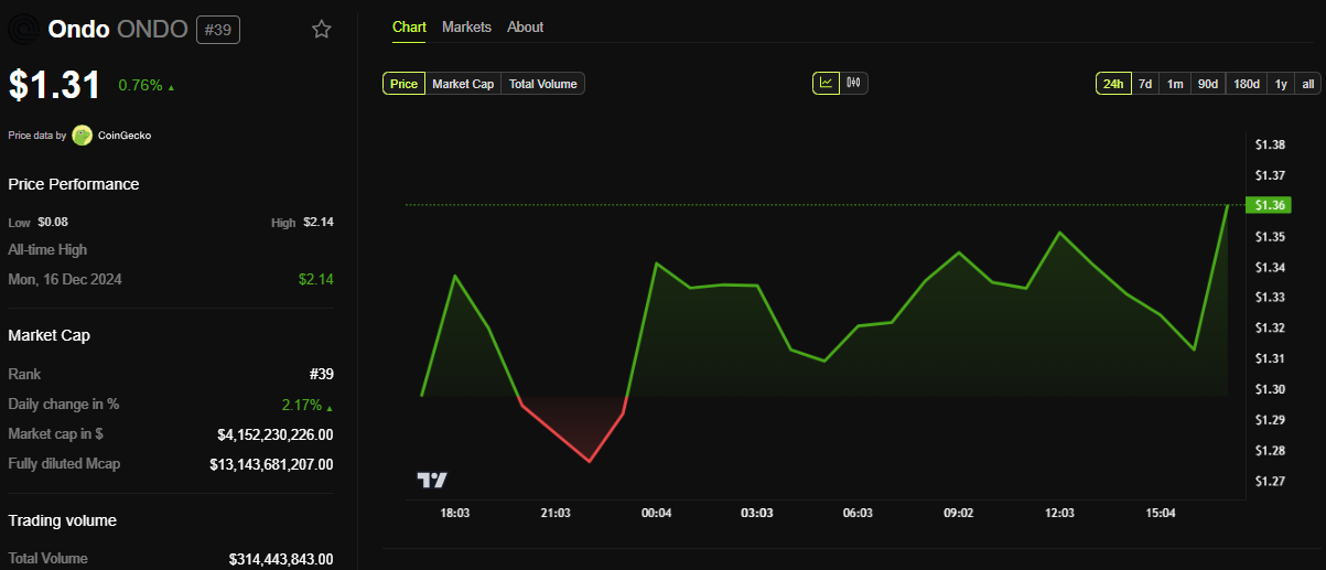 Trots rapporten har påverkan på Ondo Finance’s drivande token, ONDO, varit ganska dämpad. BeInCrypto-data visar att ONDO handlades till 1,31 USD vid skrivande stund, vilket representerar en blygsam ökning på 0,76 % sedan tisdagens session öppnade.