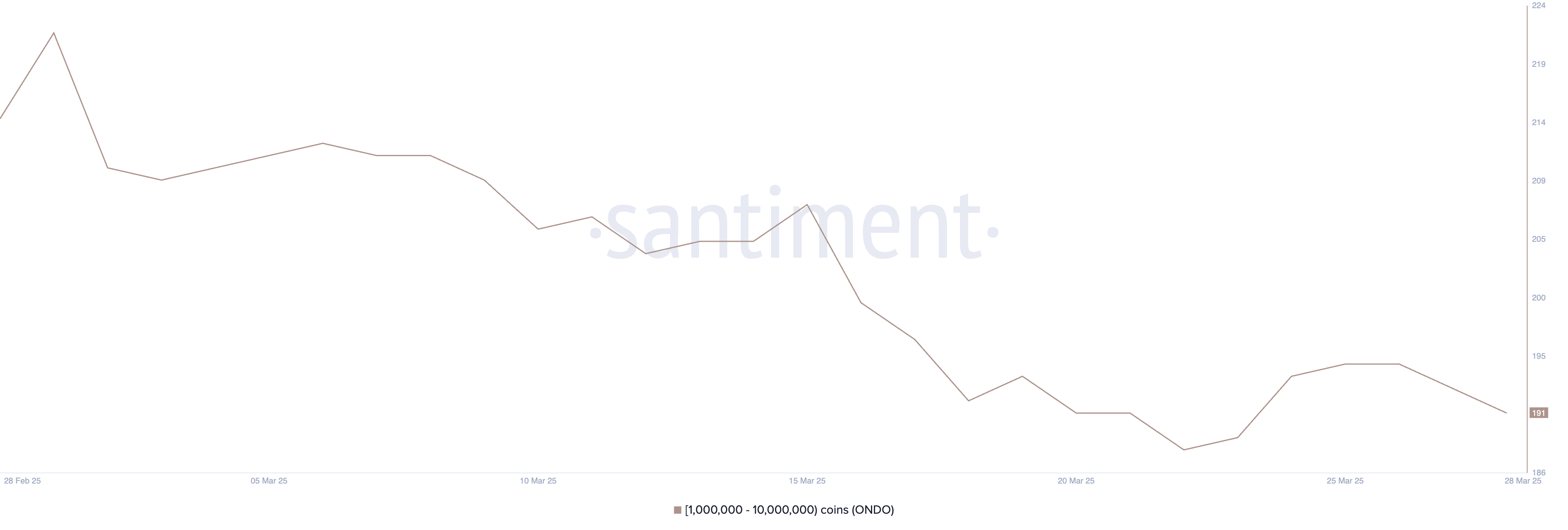 Antalet ONDO-valar—adresser som håller mellan 1 miljon och 10 miljoner ONDO—fluktuerade i slutet av mars, först ökande från 188 till 195 mellan 22 mars och 26 mars innan de minskade till 191 de senaste dagarna.