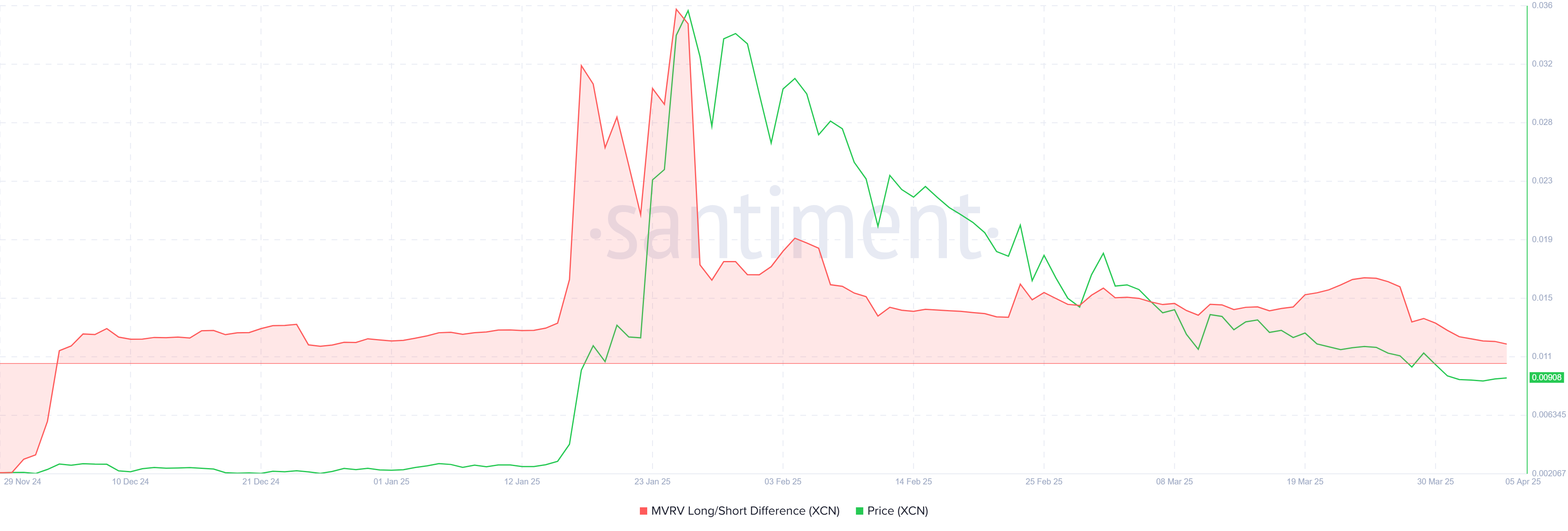 Onyxcoins pris ligger för närvarande på 0,0090 USD, efter att ha upplevt en betydande 50 % nedgång under den senaste månaden. Om den nedåtgående trenden fortsätter kan XCN falla till stödnivån 0,0083 USD, vilket ytterligare förlänger dess förluster.