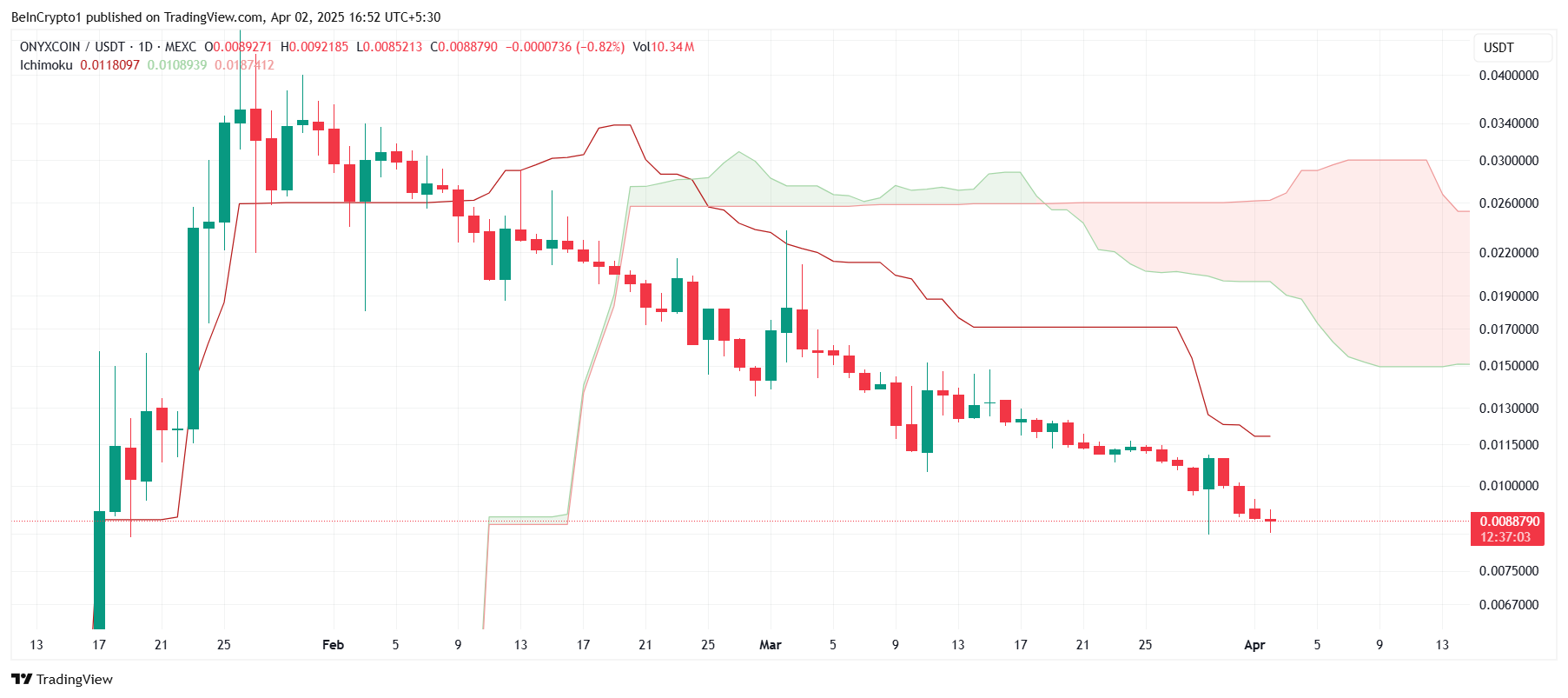 Ichimoku Cloud-indikatorn visar en dyster bild för Onyxcoin, eftersom molnen är placerade ovanför ljusstakarna. Detta tyder på att altcoinet är i en negativ fas, och utsikterna ser inte lovande ut på kort sikt. När dessa moln är ovanför indikerar det att XCN sannolikt kommer att möta ytterligare prisfall, vilket signalerar fler utmaningar framöver.