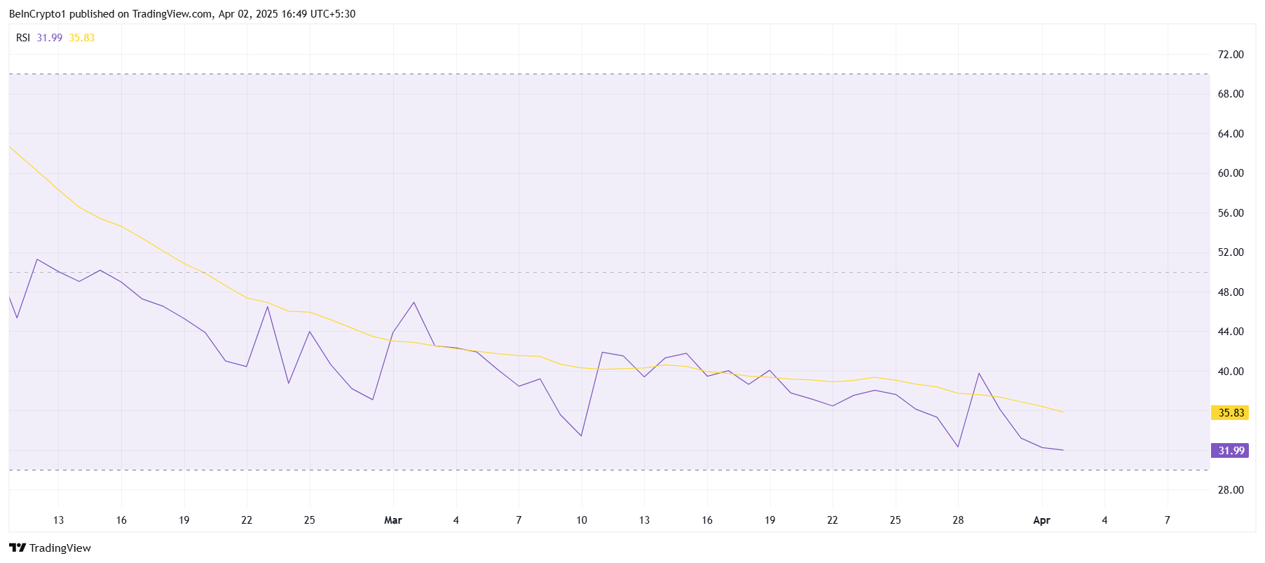 RSI:s närmande till den översålda nivån antyder att, även om en vändning kan ske snart, förblir den omedelbara framtiden negativ. Om XCN går in i den översålda zonen kan det väcka köparintresse, men i detta läge verkar en uppåtgående rörelse osannolik om inte betydande positiva marknadsförändringar sker.