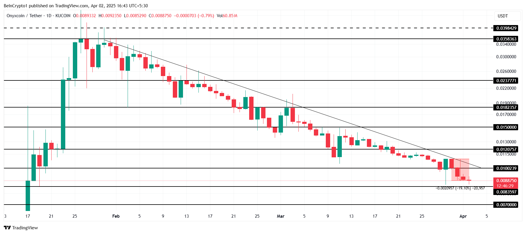 Men den negativa tesen kan ogiltigförklaras om Onyxcoin lyckas vända 0,0100 USD-nivån till stöd. Därmed kan det bryta sig ur den pågående nedgången. En uppgång mot 0,0120 USD kan signalera en förändring i momentum och återhämta några av de senaste förlusterna.