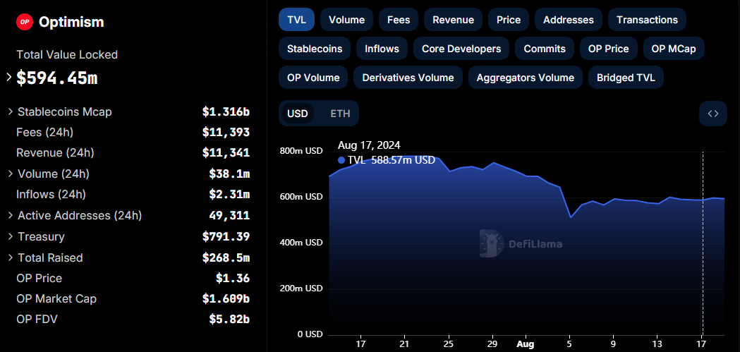 Utvecklingen speglar viktiga säkerhetsproblem som fortsätter att plåga DeFi-utrymmet. Optimisms inhemska token, OP, är ned 0,3%, i linje med den bredare marknadens dystra stämning. Trots detta är det totala värdet som är låst (TVL) i Layer-2-nätverket upp med 5,88 miljoner USD sedan nyheten om den planerade uppgraderingen bröt.