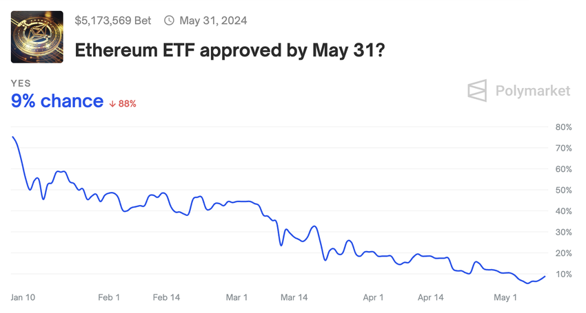 Marknadsaktörerna förväntar sig dock inte att Ethereum ETF:er ska godkännas i maj. Till exempel tror Eric Balchunas, senior ETF-analytiker på Bloomberg, att det bara finns en 25% chans att SEC kommer att godkänna denna nya finansiella produkt. Under tiden ligger en satsning på den decentraliserade vadslagningsplattformen Polymarket på bara 9%.