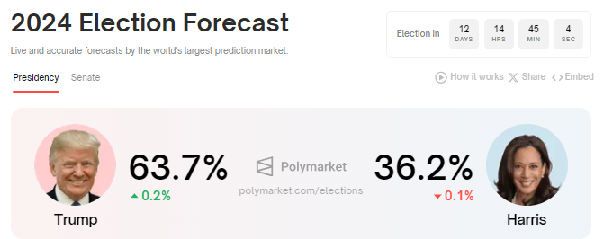 Enligt data från Polymarket fortsätter Donald Trump att öka ledningen mot Kamala Harris. Han har 63,7% chans att vinna mot Kamala Harris 36,2%.