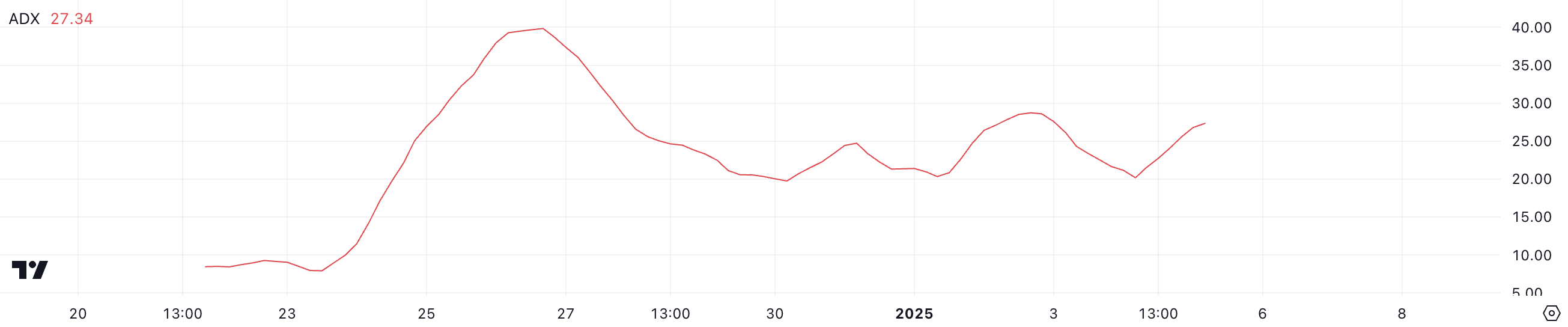 Average Directional Index (ADX) för PENGU har stigit till 27,3, upp från 20,1 bara en dag sedan, vilket signalerar en förstärkning av trenden. ADX mäter trendstyrka på en skala från 0 till 100, där värden över 25 indikerar en stark trend. Medan upptrenden förblir intakt, antyder den långsammare takten i ADX-tillväxt att momentum kan stabiliseras.