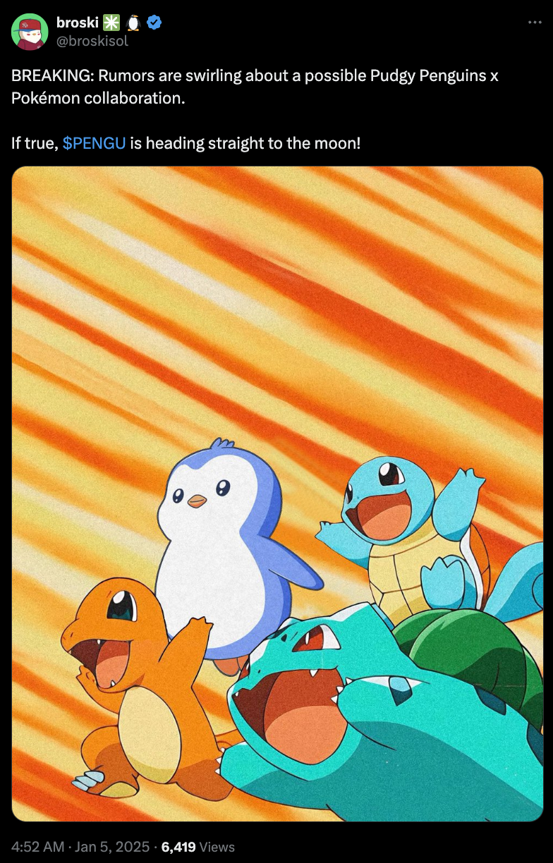Ett nyligen tweet av Pudgy Penguin-innehavaren @broskisol har väckt uppståndelse inom PENGU-gemenskapen. Inlägget antyder rykten om ett möjligt samarbete mellan Pudgy Penguins och Pokémon, vilket, om det bekräftas, kan höja projektets status avsevärt.