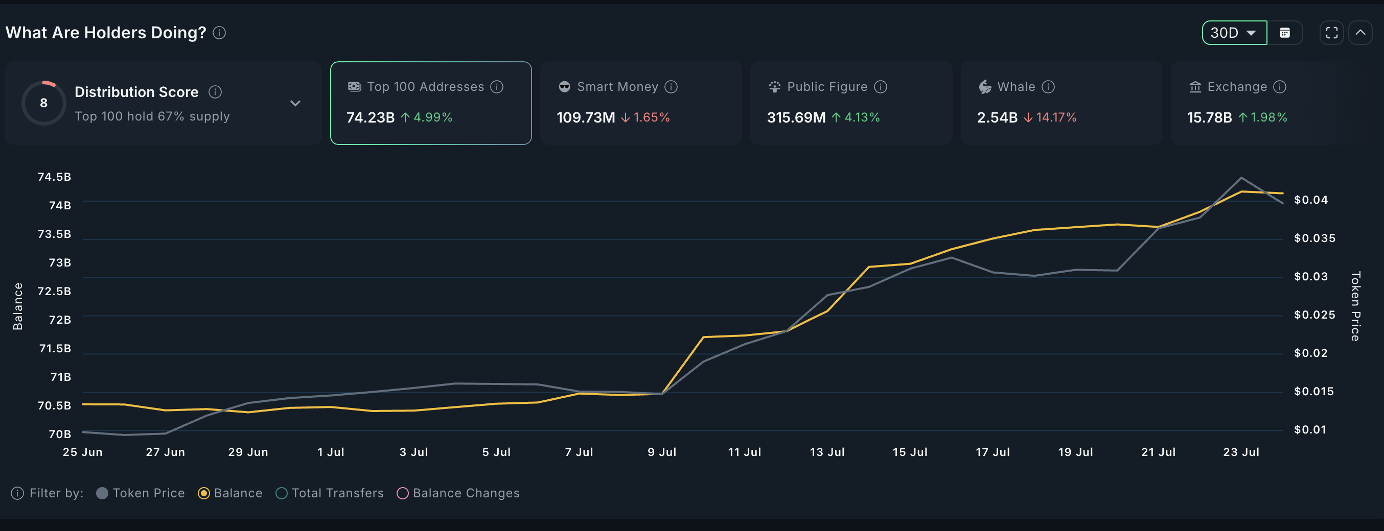 Börsflöden ökade med 2,18 % bara under de senaste 24 timmarna, vilket ger det totala börsinnehavet av PENGU till 15,79 miljarder. Det betyder att ungefär 336 miljoner tokens, värda cirka 13,4 miljoner USD, flyttades till börser på en enda dag. Dessa typer av toppar indikerar vanligtvis ökande säljtryck, eftersom handlare förbereder sig för att sälja sina innehav.