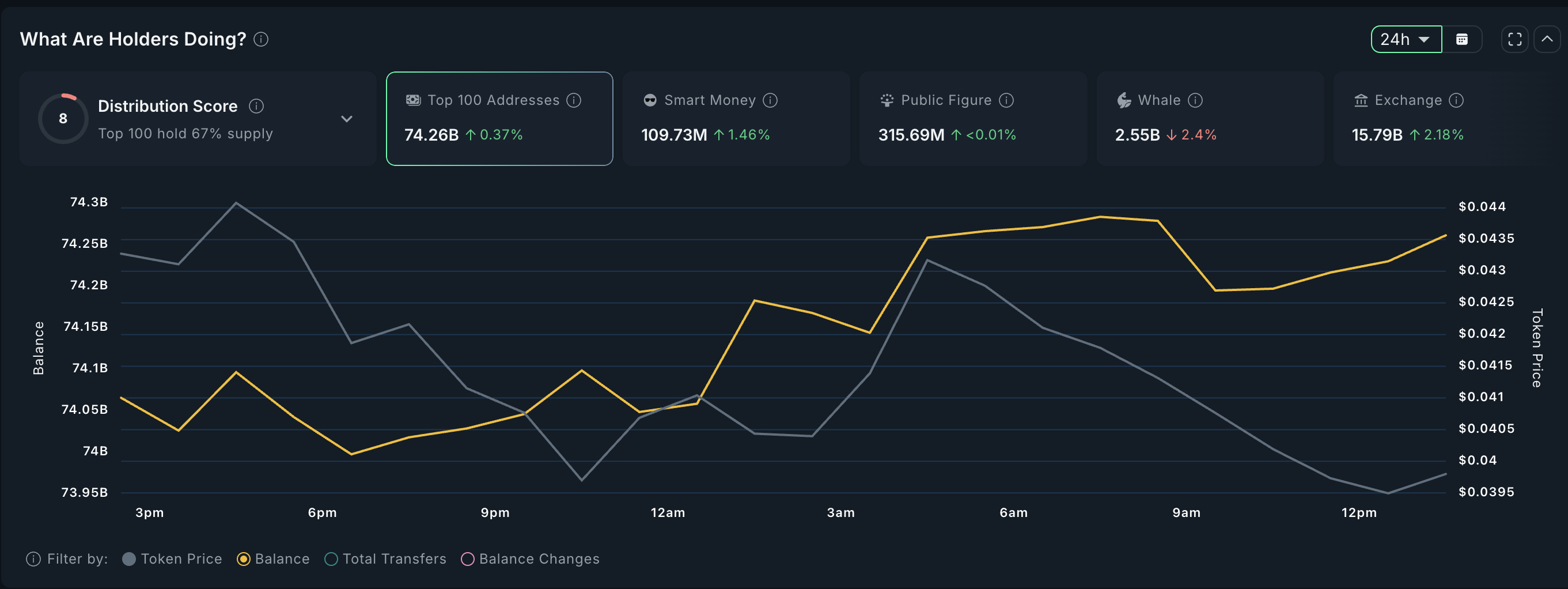 Valaktiviteten fortsätter att luta åt det negativa hållet. Under de senaste 24 timmarna har valar minskat ytterligare 2,4 % av PENGU:s cirkulerande utbud. Vid det nuvarande priset på 0,04 USD är det cirka 152 miljoner PENGU-tokens värda över 6 miljoner USD. Även om försäljningstakten har saktat ner jämfört med 30-dagars- och 7-dagarstrenderna, är den övergripande riktningen fortfarande nedåt.